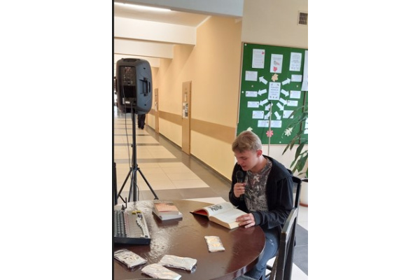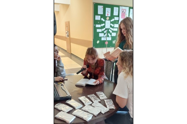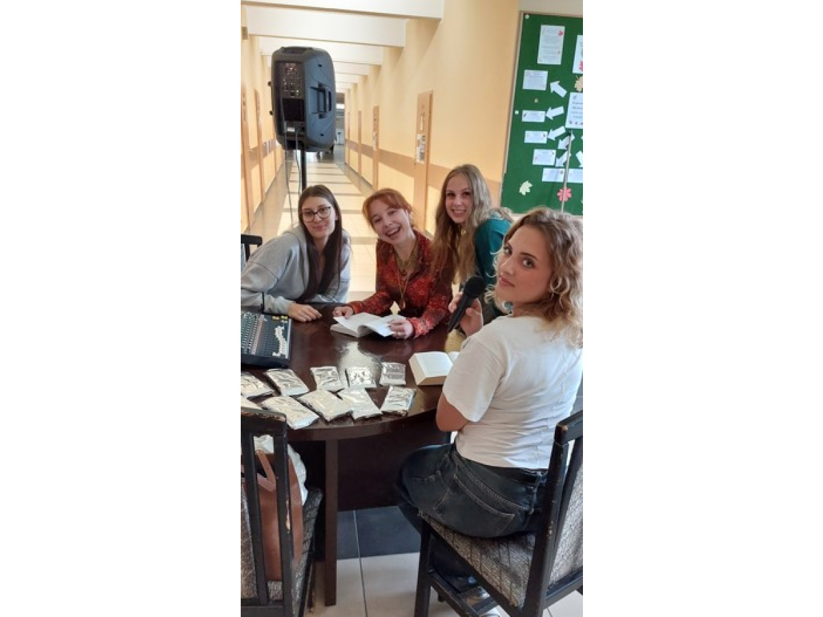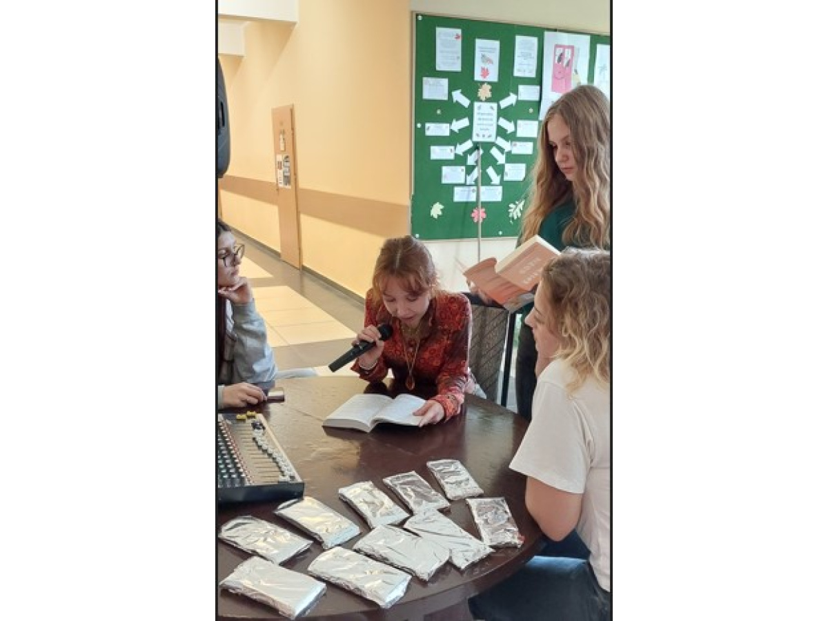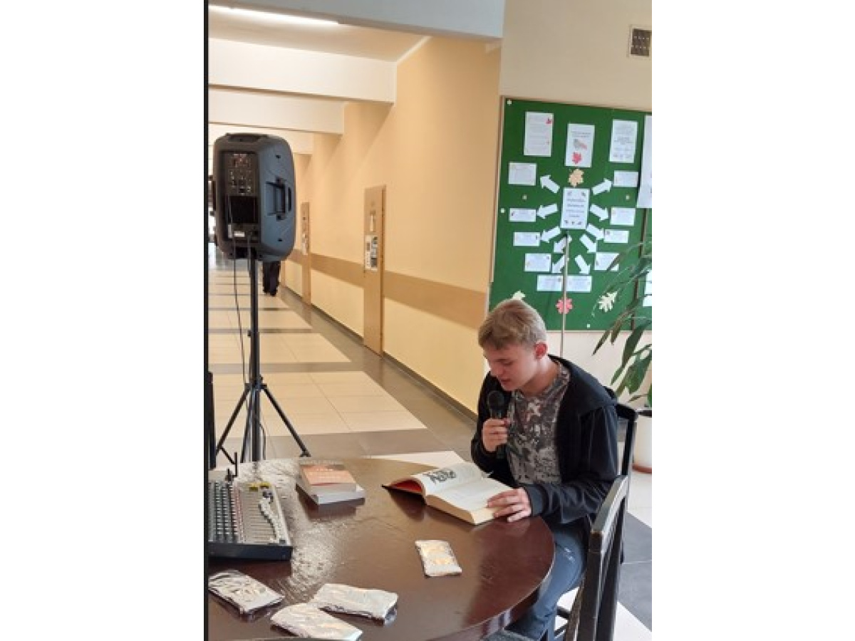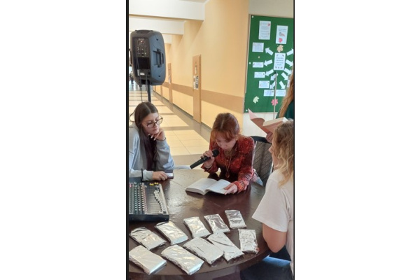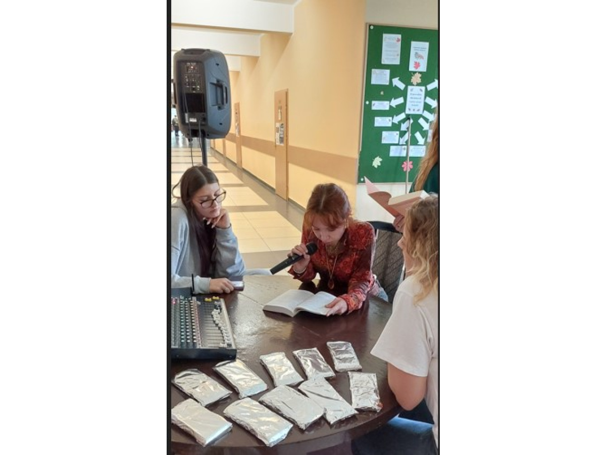 29 września to Dzień Głośnego Czytania. Z tej okazji właśnie dzisiaj biblioteka szkolna wyszła na korytarz i zaprosiła 10 śmiałków do wspólnego, głośnego czytania. Chętne osoby przeczytały dowolne fragmenty wybranego przez siebie utworu literackiego. Wybrzmiały fragmenty książki „Gdzie śpiewają raki” Delii Owens, „List w butelce” Nicholasa Sparksa, „Hobbita” Tolkiena, "Ferdydurke" Witolda Gombrowicza, czy „Małego księcia” Antoine’a de Saint – Exupery... Nawiązując do czytanej przed laty publikacji „Charlie i fabryka czekolady” Roalda Dahla, każdy z czytelników otrzymał czekoladę, w jednej z nich znajdował się tzw. „Golden ticket” uprawniający do otrzymania nagrody.