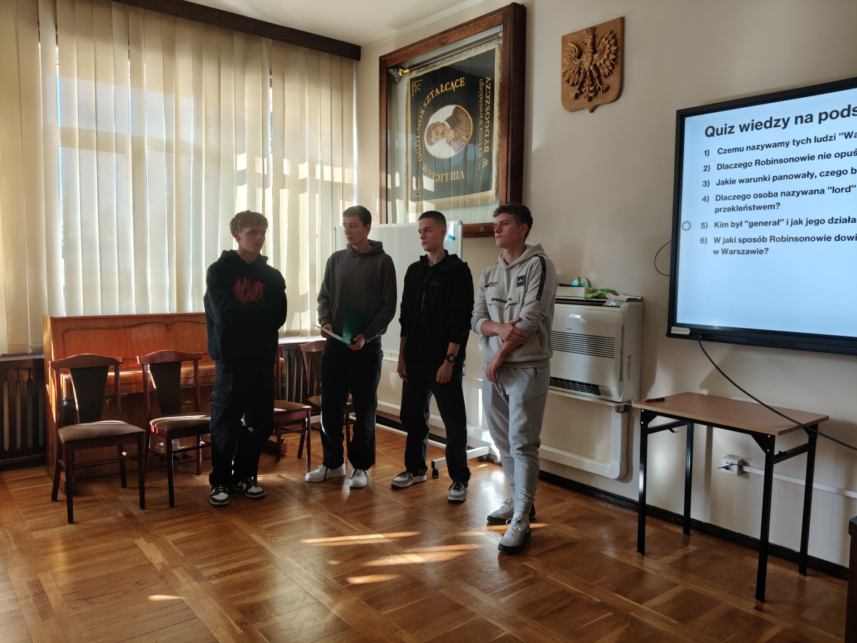 Tym razem uczniowie klasy 3w – Jakub, Bartosz, Miłosz i Nikodem – przygotowali wyjątkową lekcję o „Warszawskich Robinsonach”, czyli tych, którzy po upadku Powstania ukrywali się w ruinach miasta.