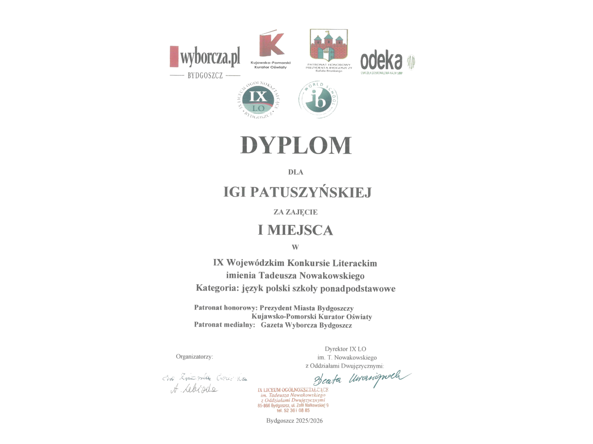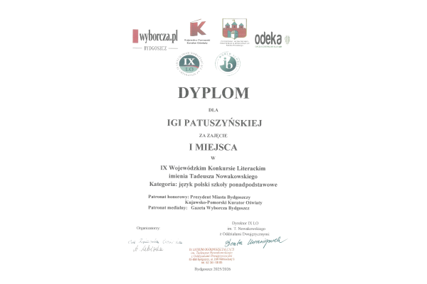 Z radością i dumą informujemy, że uczniowie klasy 3a zostali laureatami IX Wojewódzkiego Konkursu Literackiego imienia Tadeusza Nowakowskiego w kategorii język polski.